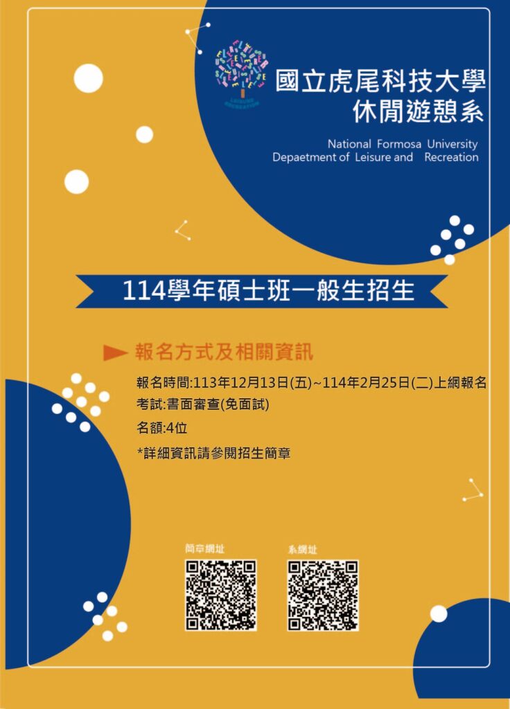 114學年度碩士班一般生招生 2024-12-13 SystemAdmin 114學年度碩士班一般生入學招生已開始報名,請把握時間踴躍報考! 相關資訊如下: 報名日期:113年12月13日至114年02月25日止(一律採網路登錄報名,上傳報名資料,無須再郵寄紙本) 報名網址: https://enrollstudents.nfu.edu.tw/ 考試方式:書面資料審查(免面試)。 一般生招生海報