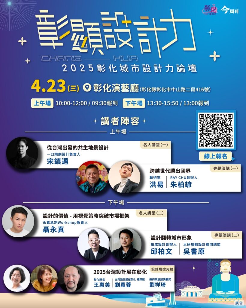 一、「2025臺灣設計展在彰化」將於今年10月盛大舉辦,彰化縣政府為設計展提前預熱,訂於4月23日在彰化演藝廳舉辦旨揭展覽,當天壓軸論壇由彰化縣長王惠美與臺灣設計展在彰化總策展劉真蓉、縣府策展諮詢顧問劉祥琦,暢談「2025臺灣設計展在彰化—設計展搶先聽」,讓參與者率先了解設計展亮點與規劃。還邀集宋鎮邁、聶永真、洪易、朱柏諺、邱柏文、吳書原等6位設計界重量級大師齊聚彰化,率先點亮設計與城市之間的創新能量。