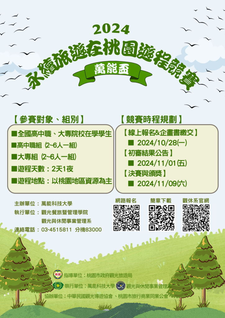 (六)、主題內容:以『永續旅遊』設計為框架。規劃以桃園地區休閒旅遊景點,以永續旅遊為 主,以實踐並結合綠色旅遊概念為遊程主體,結合各組自選桃園地區休閒旅 遊景點、特色餐食、人文歷史風情等設計出符合永續概念,並能呈現推廣永 續旅遊觀光魅力。