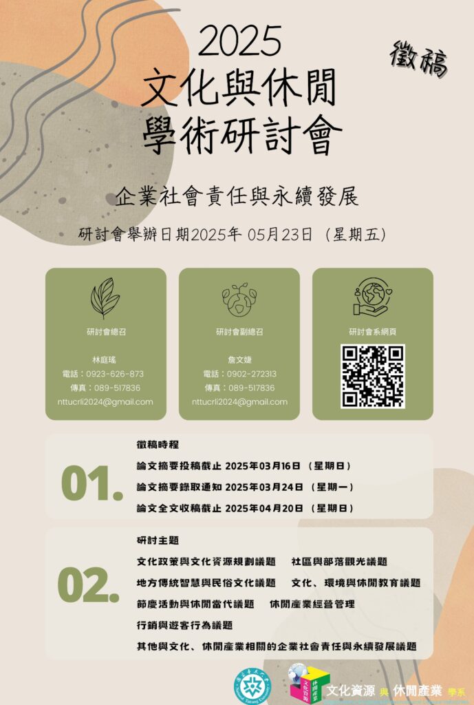國立臺東大學文化資源與休閒產業學系擬於114年5月23日(五)舉辦「2025文化與休閒學術研討會-文化與休閒的企業社會責任與永續發展」。 2024-11-29 AdminAdmin 一、檢附研討會之徵稿海報與邀稿訊息。 二、研討會舉辦日期為114年5月23日(五),鼓勵所屬師生踴躍報名參加。 三、相關事宜請洽研討會專責郵件信箱:nttucrli2024@gmail.com。 邀稿通知下載
