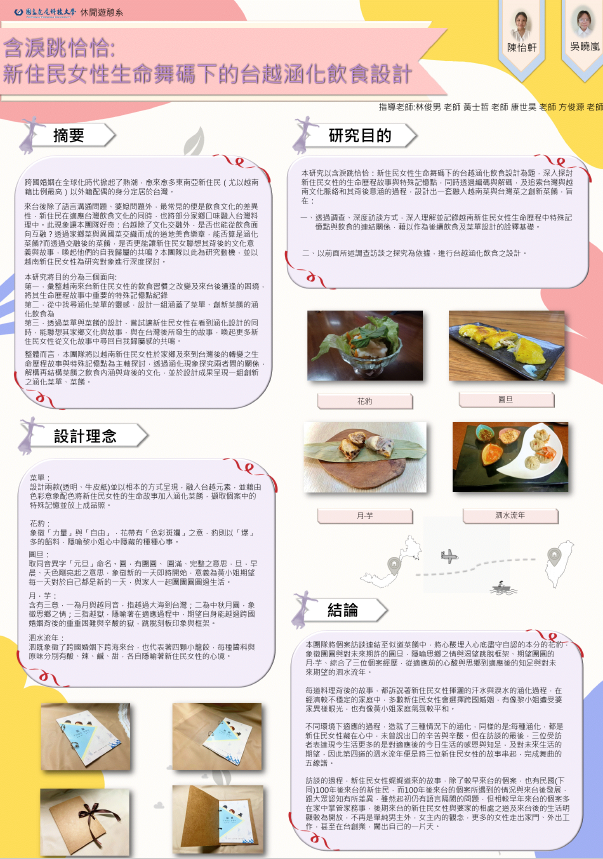 整體而言,本團隊將以越南新住民女性於家鄉及來到臺灣後的轉變之生命歷程故事與特殊 記憶點為主軸探討,透過涵化現象探究兩者間的關係,解構再結構菜餚 之飲食 內涵與背後的文化,並於設計成果呈現一組創新之涵化菜單、菜餚 。