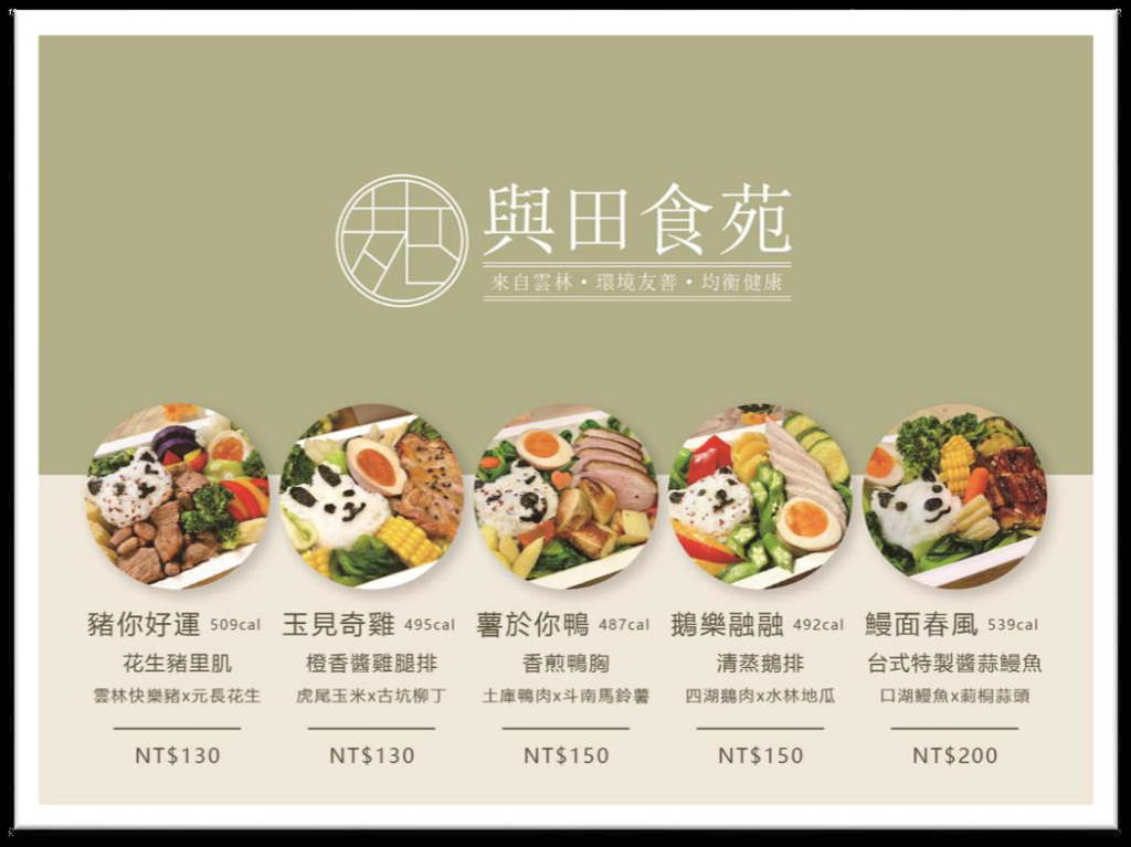 台灣十大死因中有8項死因是與飲食習慣有直接的影響,因此「健康飲食」是以預防因飲食習慣所衍生出的健康問題為目的而產生的,而健康飲食在政府的宣傳與注重體態的流行下日漸盛行。因此,本團隊計畫成立一個健康餐盒品牌「與田食苑」推出以雲林當地特色物產為主題的健康環保餐盒,利用友善環境之概念地產地銷、縮短產地到餐桌間的距離 作為核心精神,在餐盒外包材使用生物可分解塑膠, 達到友善環境、減少碳足跡之目的。最後規劃設計出五款雲林鄉鎮特色健康餐盒「豬你好運」、「玉見奇雞」、「薯於你鴨」、「鵝樂融融」、「鰻面春風」,同時透過架設官方網站 ,在餐盒外提供 QRcode 導入官網 ,讓消費者享用低碳健康餐盒的同時, 亦可 達到本團隊之推廣雲林的特色物產之目的。