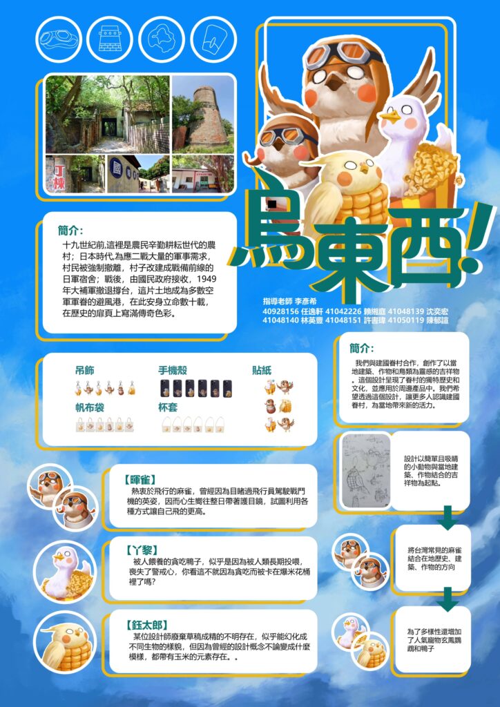 創作了以當地建築、作物和鳥類為靈感的吉祥物。這個設計呈現了眷村的獨特歷史和文化,並應用於周邊產品中。