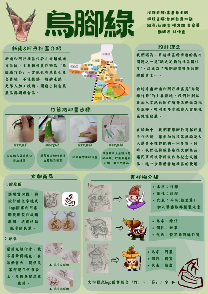 由李彥希老師指導學生蘇沛淳、楊方誼、吳家蓁、鄒明志、林佳宜等,烏腳綠團隊認為目前社區所面臨的核心問題之一是”缺乏足夠的社區關注度”