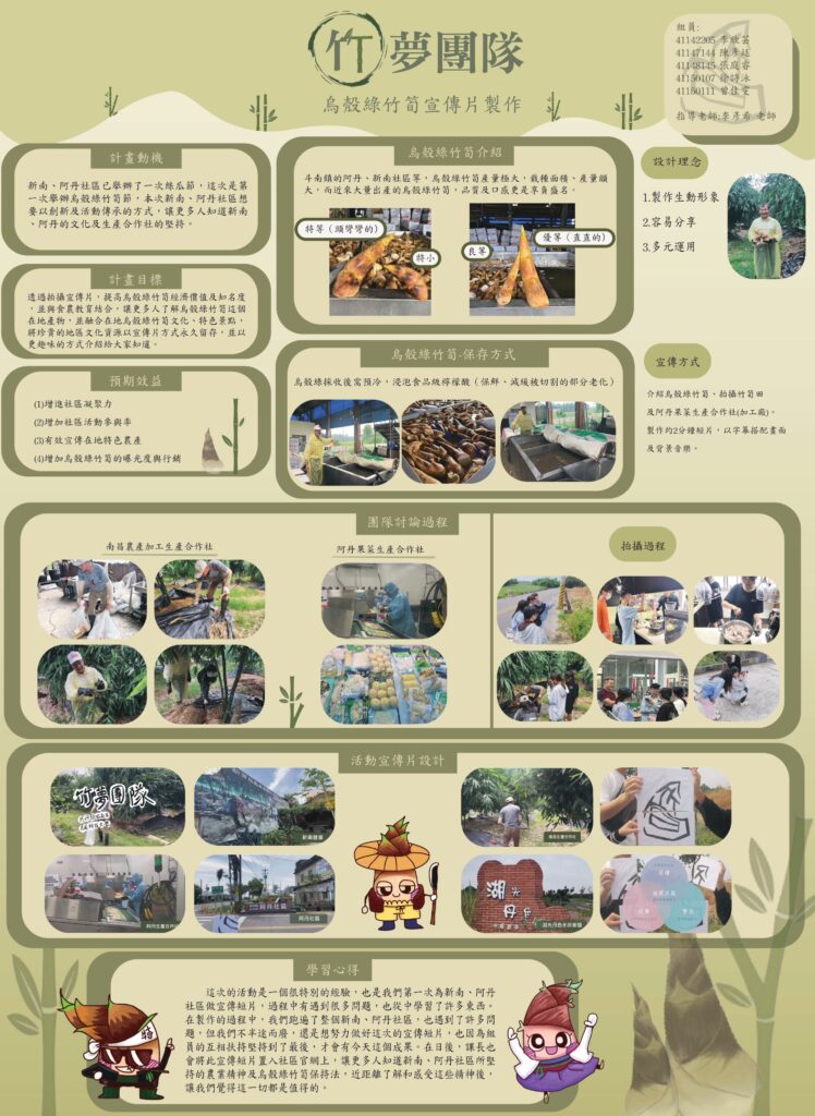 由李彥希老師指導學生李欣芸、 陳彥廷、 張庭睿、徐詩泳、曾佳雯等,透過拍攝宣傳片,提高烏殼綠竹筍經濟價值及知名度